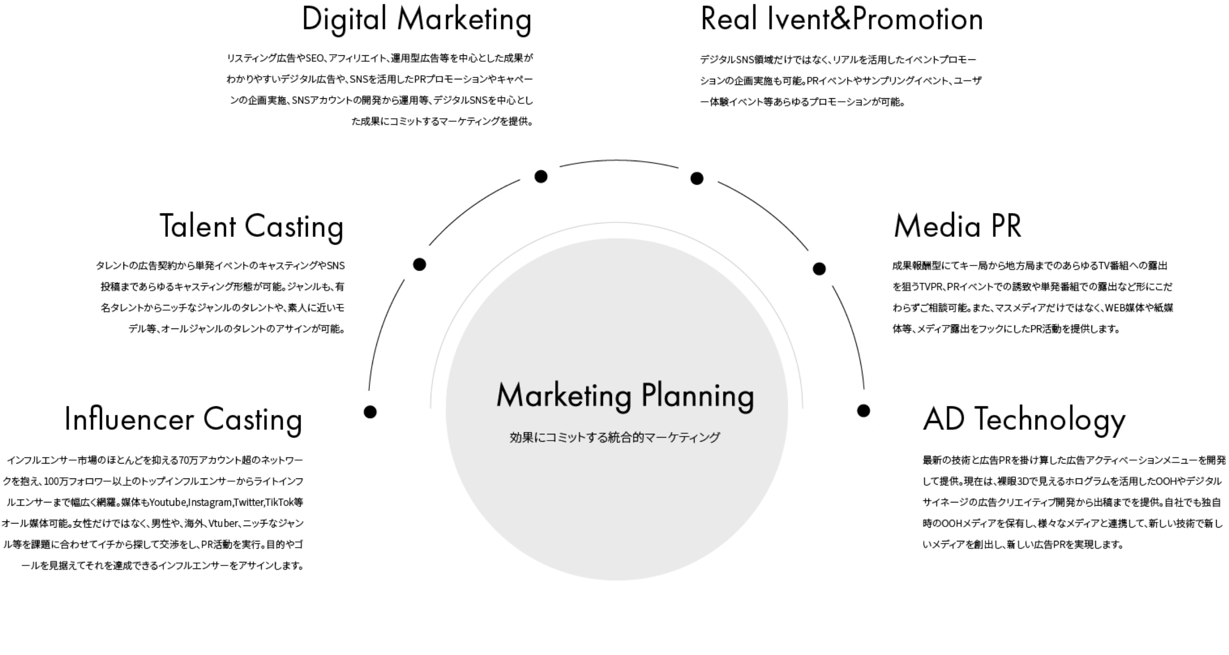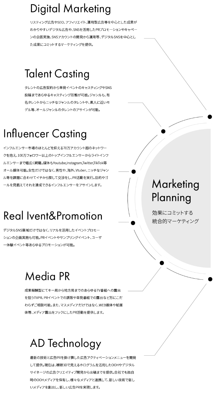 SNSマーケティングを強みとして、インフルエンサーキャスティングを軸にしたPRプロモーションを得意としています。